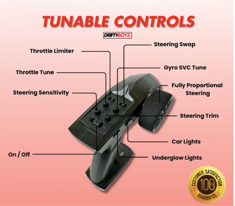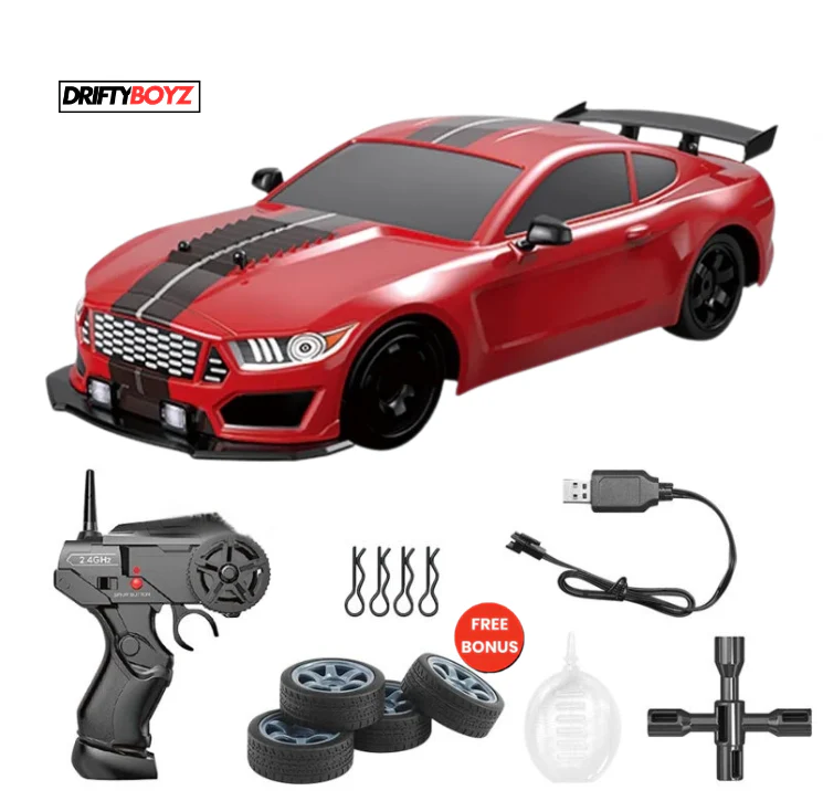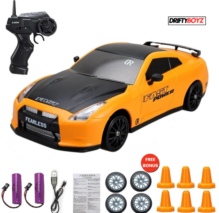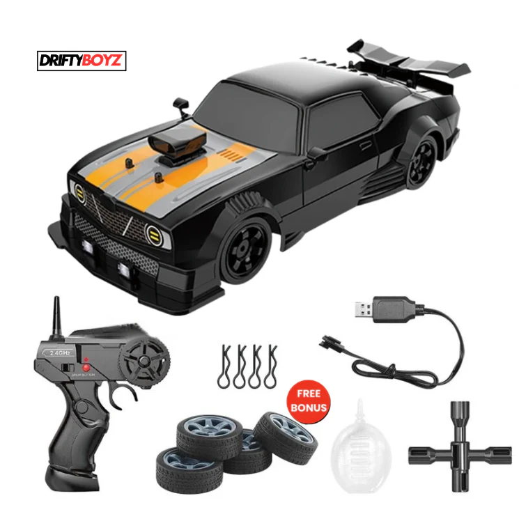 Drifty Boyz are equipped with slick drift tires. They allow the car to hit a perfect corner exit. They also come with rubber tire covers so you can slip them on and be able to reach speeds up to 10 mph!